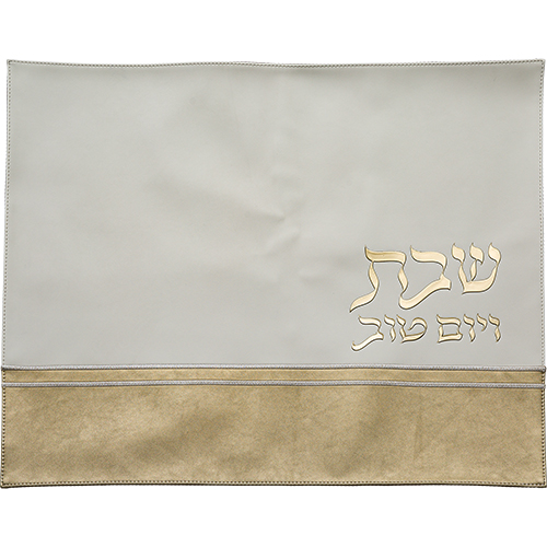 כיסוי חלה יוקרתי בעיצוב אלגנטי, עשוי דמוי עור איכותי בגוון זהב, בגודל 45×55 ס״מ. הכיסוי משדרג כל שולחן שבת וחג, עם כיתוב מוזהב "שבת ויום טוב" המוסיף נופך חגיגי ומכובד.